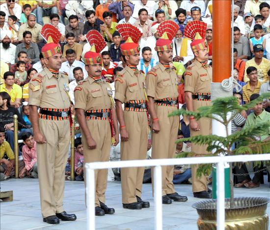 Indian Rangers standing actively in parade ceremony at kasur border. Indian and Pakistani rangers performs flag ceremony on daily bases.